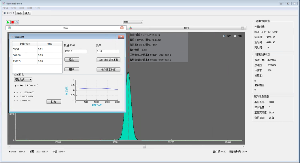 ● 本底指标:针对效率为60%的高纯锗谱仪,能量范围40keV~2MeV, 积分本底保证值≤2.5cps(1.6cps可选)。